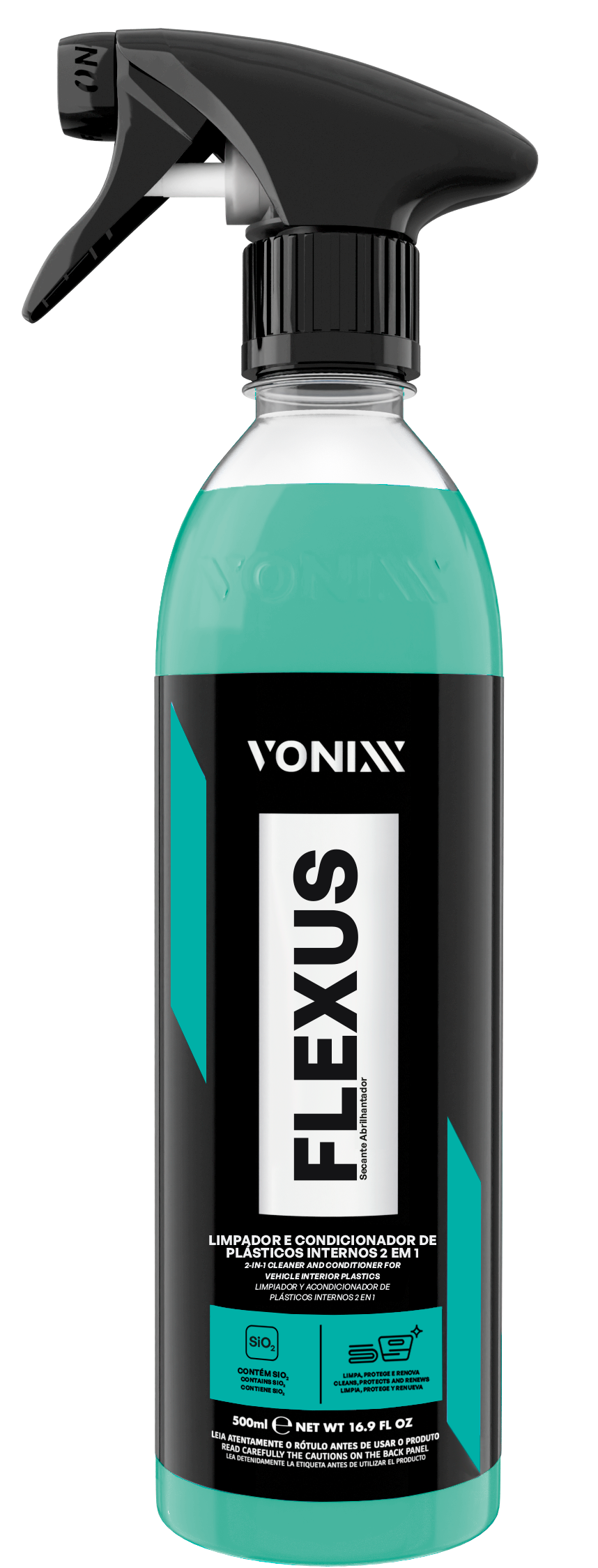 The FLEXUS is a 2-in-1 interior plastic cleaner and conditioner developed by VONIXX. It effectively cleans and protects interior plastic surfaces in vehicles. The product contains SiO₂ (ceramic) in its formula, enhancing durability and preventing a sticky residue. It provides a dry-to-the-touch finish, leaving the plastic clean with an original appearance and protection lasting up to 3 months.