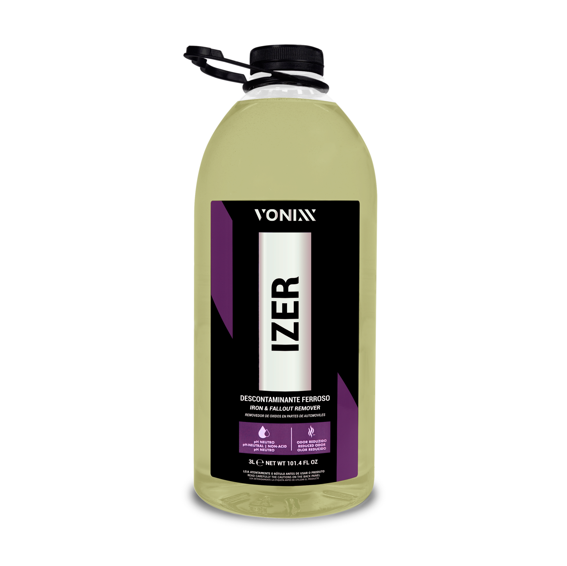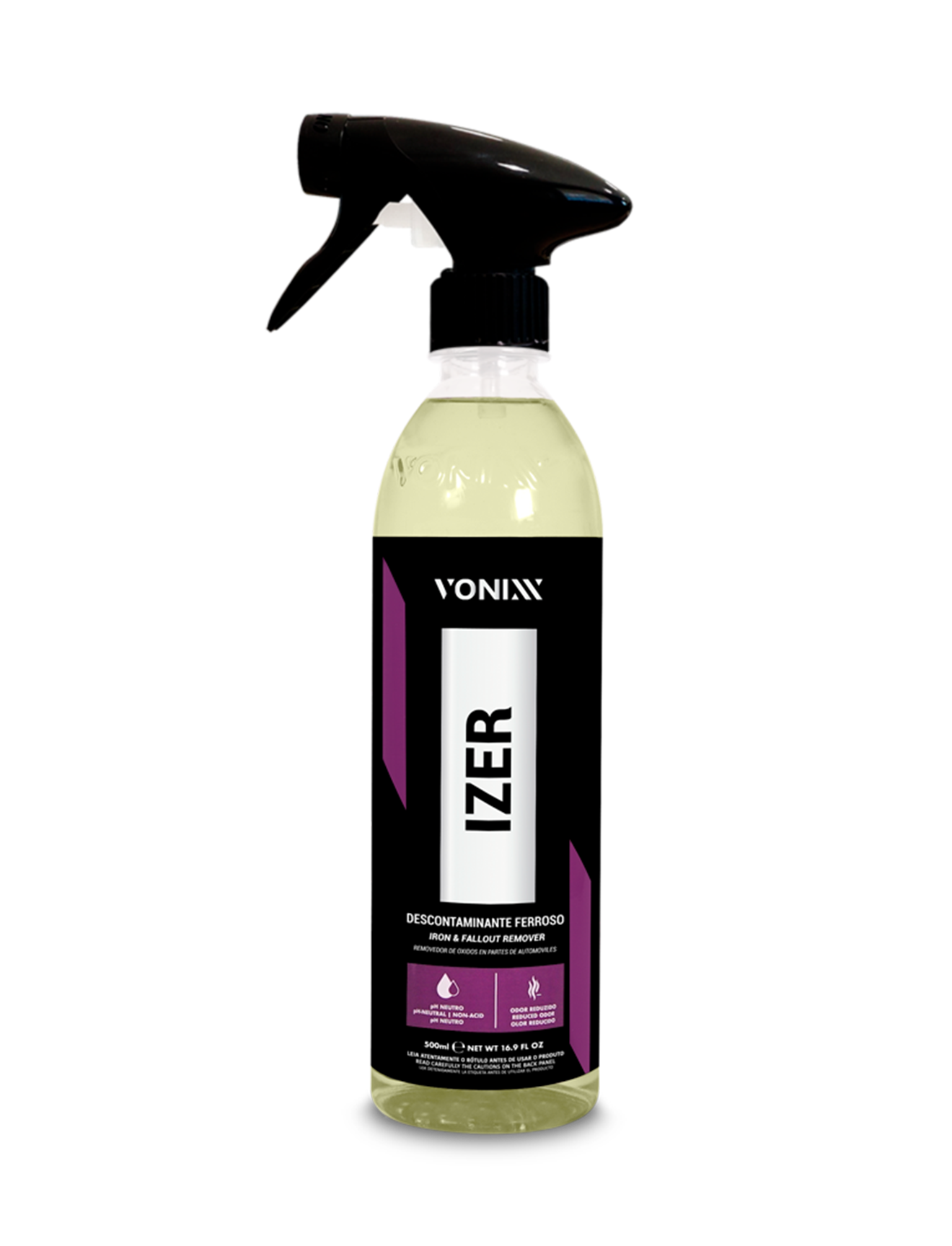 IZER - is a neutral pH iron decontaminant that removes oxidized brake dust from wheels, eliminates iron material oxidation from the paint and other external parts of the vehicle, and aids in removing rust spots on chrome parts. In the engine bay, it assists in removing oxidation from metal parts, leaving them looking renewed. The product is not recommended for use on galvanized surfaces.