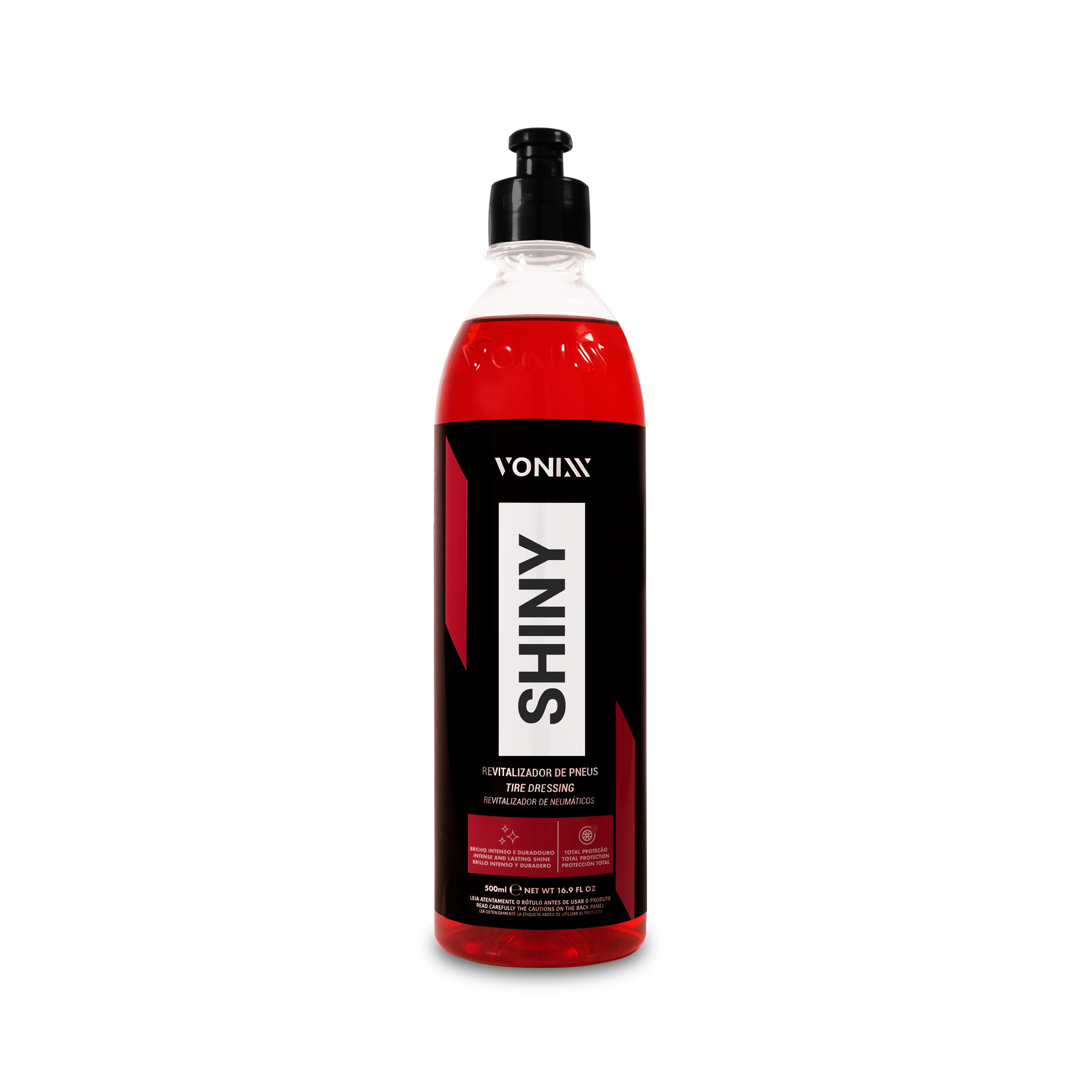 Shiny is a product exclusively developed for tire use, renewing, protecting, and providing intense and long-lasting shine to tires. The product does not wash off upon contact with water, offering durability of up to 60 days and yielding 15 to 20 applications on small cars while maintaining a wet look on the tire.