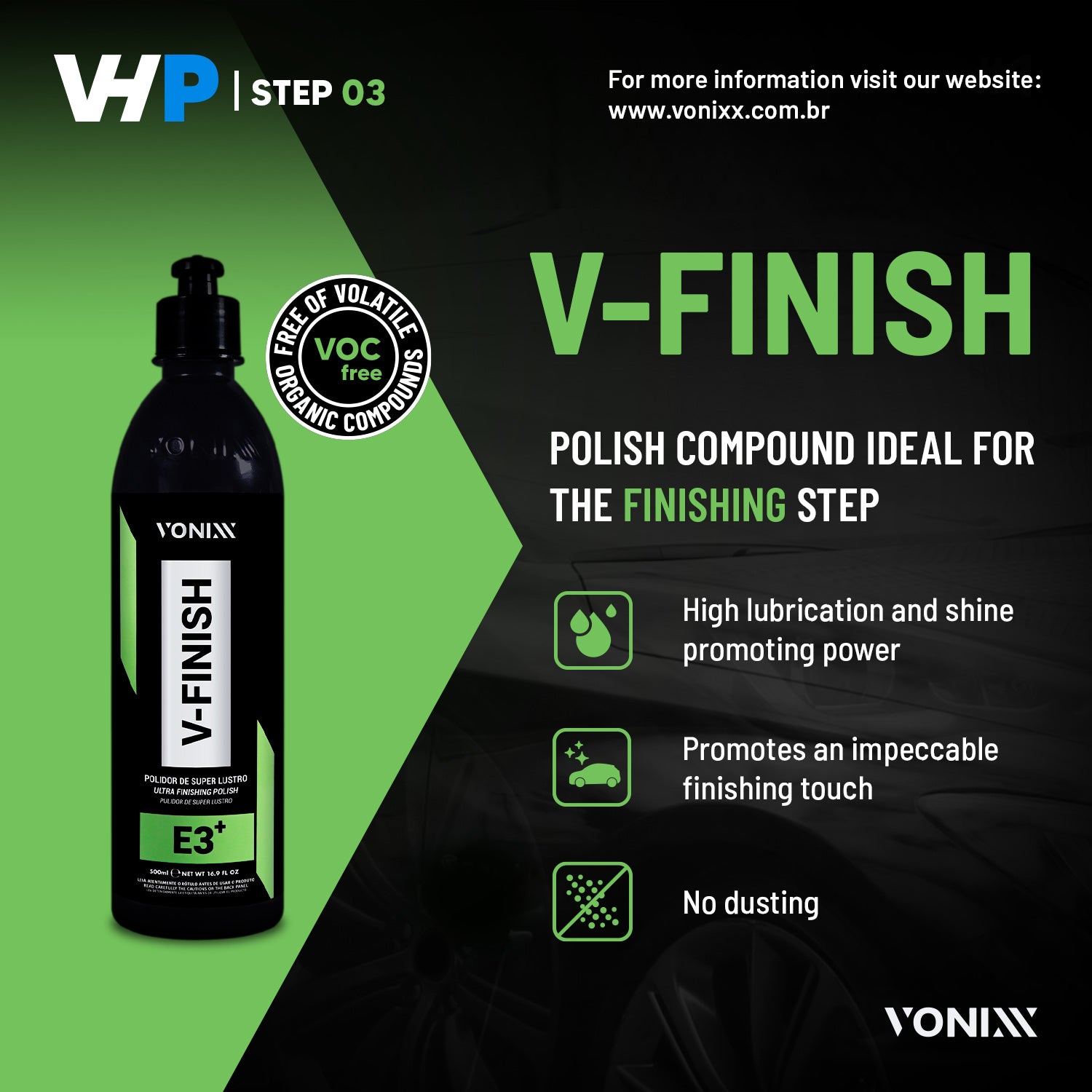 - Application: Shake the product well before use. Apply a small amount of V-FINISH onto a soft foam applicator pad, spreading it evenly over a 50 cm x 50 cm area using circular and uniform movements.